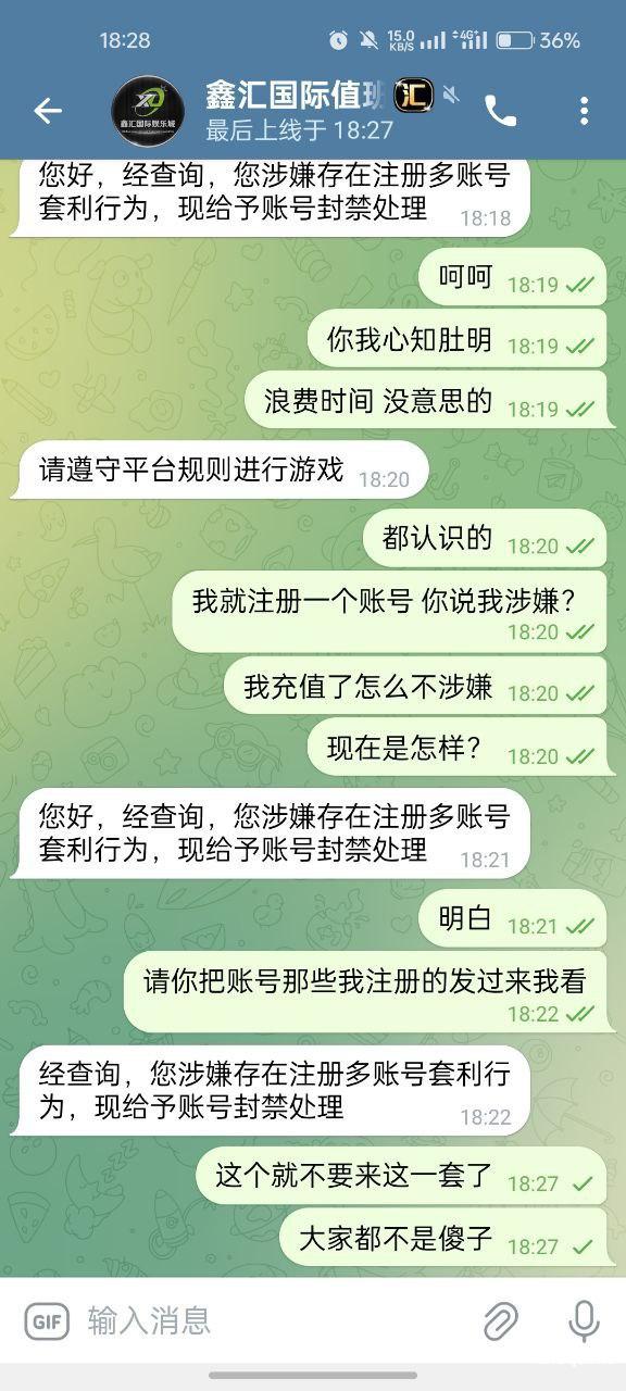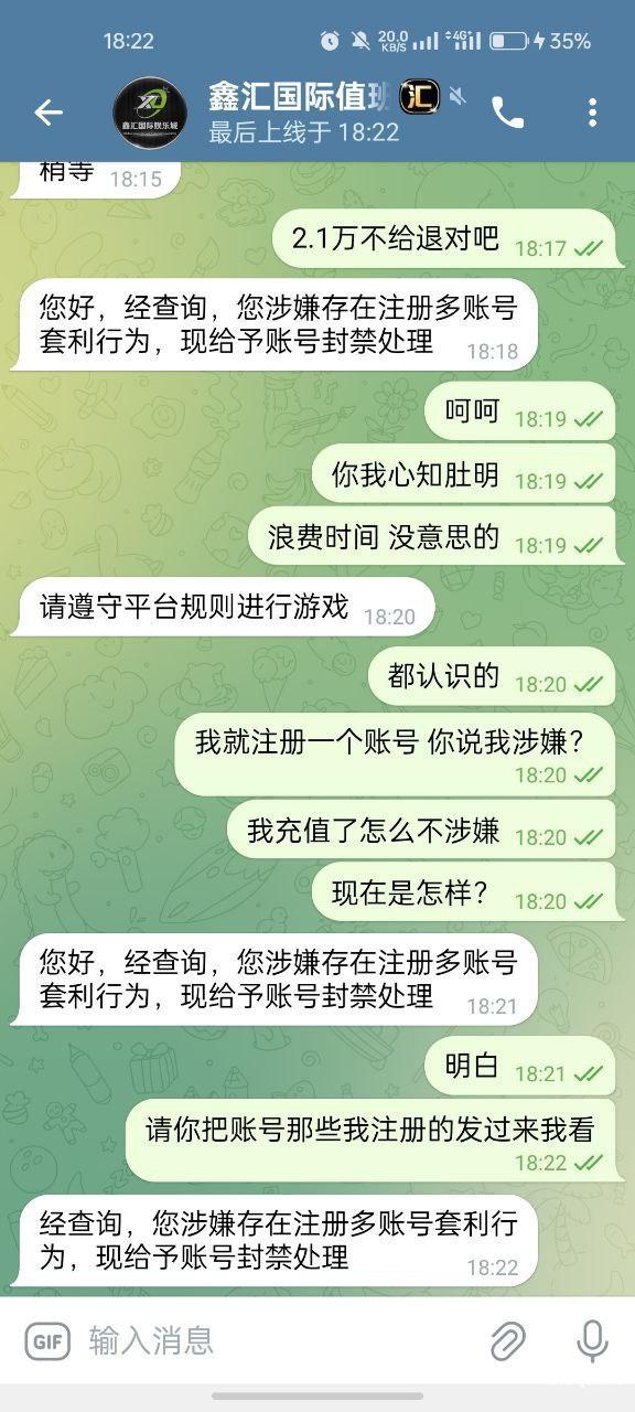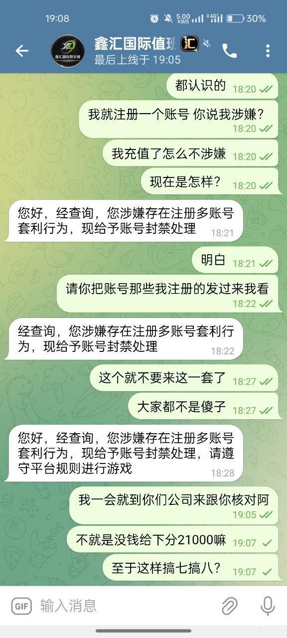 谁玩谁倒霉 输不起的! 事情是这样的 我朋友推荐我注册这款游戏有送288打十五倍流水最高下分38$于是用我手机申请了也送了 没兴趣玩给朋友玩输光了,第二天无聊随手充值50汇旺赠送百分之50 也就是350+175=525分 打十倍流水也就是1750流水即可下分!可是上一天一个不小心让我来了一把下注100免费旋转赢了21000分 当时我咨询客服是否可以下分的问题 让我等待 等待来的只是机器人回复 说我多个账号违规套利!他妈的充值时候怎么不违规不让上分呢?下分就违规!账户有25000多分折和汇旺3500$左右!让他退回本金都舍不得!那个客服诗碗估计他妈喝农药没钱买贪污我65本金没钱买农药,以前传奇娱乐公司是在长城 负责人叫辕辕!小胖等 现在不知道是否在长城有没有知道的朋友 或者有被黑的玩家的 真心害群之马搞的现在对所有娱乐充值都心慌只怕不出款!